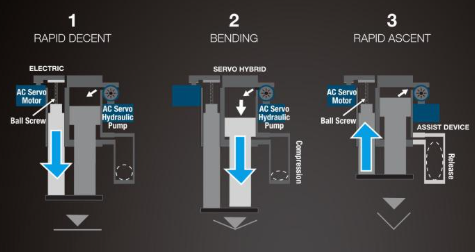 - Once at pinch point, a servo-hybrid hydraulic system takes over for bending movement and tonnage .